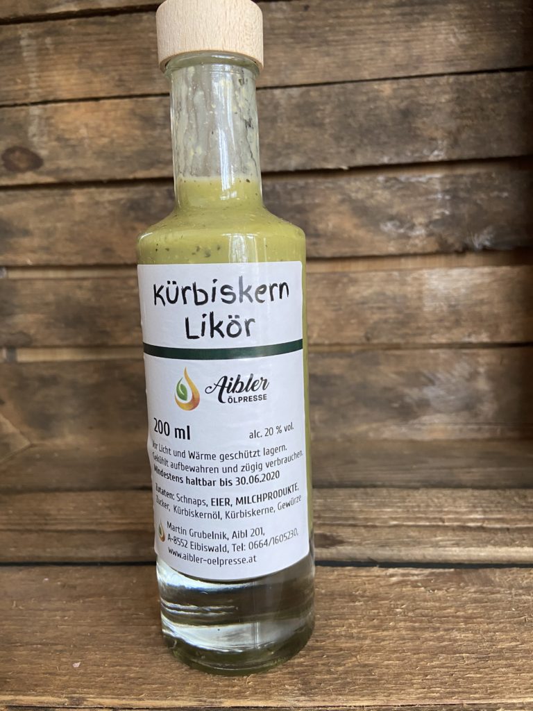 Kürbiskernlikör 200 ml, alc. 20 % vol. angesetzer Likör. Zutaten: Schnaps, Eier, Milchprodukte, Zucker, Kürbiskernöl, Kürbiskerne, Gewürze. Schmeckt Pur mit und ohne Eis. Verfeinert Vanilleeis, Pudding uvm.